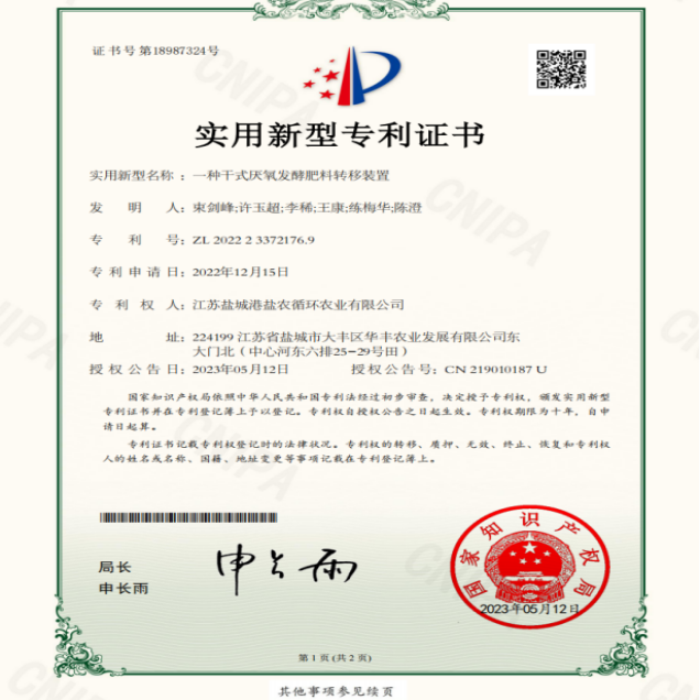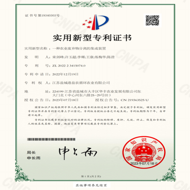 扎實推進科研創(chuàng)新,不斷將理論研究成果轉化到實際生產過程與產品中,截至目前,鹽農循環(huán)農業(yè)先后取得了3個肥料登記證,獲得自主研發(fā)專利24項(其中發(fā)明專利4項),另外還有15項專利已受理。率先使用新型機械沼液還田機,實現沼液在旱作物大面積推廣施用,替代70%以上化肥用量,將理論轉化為實際。“沼液在稻麥輪作上施用技術規(guī)范”地方標準成功立項,為沼液推廣應用打下堅定的基礎。 申報成功國家高新技術企業(yè)、江蘇省農業(yè)科技型企業(yè)、江蘇省三星上云企業(yè)、市級農業(yè)產業(yè)化龍頭企業(yè)等稱號。與揚州大學等高校共同申報的2022年江蘇省碳達峰碳中和科技創(chuàng)新專項資金項目-沿海灘涂農田生態(tài)碳匯能力提升模式構建和試驗示范基地建設也正在按進度穩(wěn)步推進。
