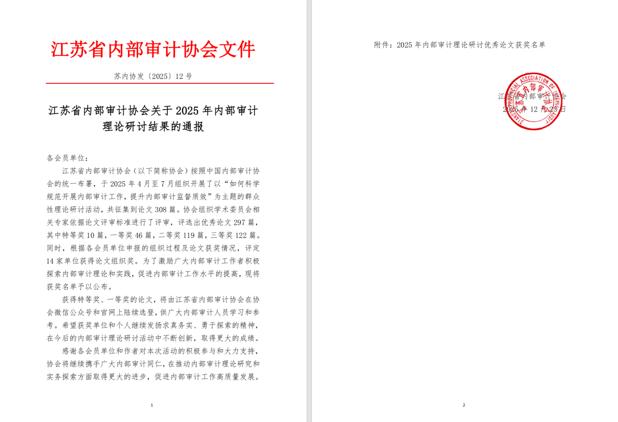 12月24日,江蘇省內(nèi)部審計(jì)協(xié)會(huì)公布了2025年度省內(nèi)部審計(jì)理論研討活動(dòng)獲獎(jiǎng)結(jié)果,集團(tuán)審計(jì)部報(bào)送的《國(guó)企內(nèi)部審計(jì)科學(xué)規(guī)范與提質(zhì)增效路徑探索——基于鹽城港集團(tuán)實(shí)踐的分析》論文榮獲一等獎(jiǎng)。