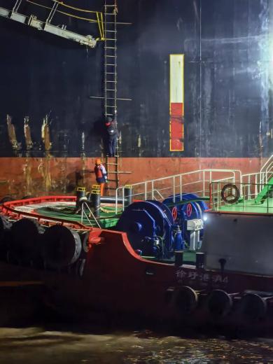 方案既定,迅速行動。大豐港區內,值班的“002號”引航員發現潮汐窗口期恰逢午間,毫不猶豫放棄午休,即刻投身引航作業;“017號”引航員主動請纓、堅守崗位,與同事并肩作戰。兩位引航員以身作則、沖鋒在前,以廢寢忘食的奉獻精神,歷時四小時高效推進作業,順利完成大豐港區4艘外輪及1艘危化品船的安全靠泊,用專業與堅守扛起責任。統一統籌調度下,濱海港區的煤炭運輸船、LNG船精準把握高潮時段,平穩靠妥對應泊位,各港區引航作業同步推進、無縫銜接,確保了整體任務進度。