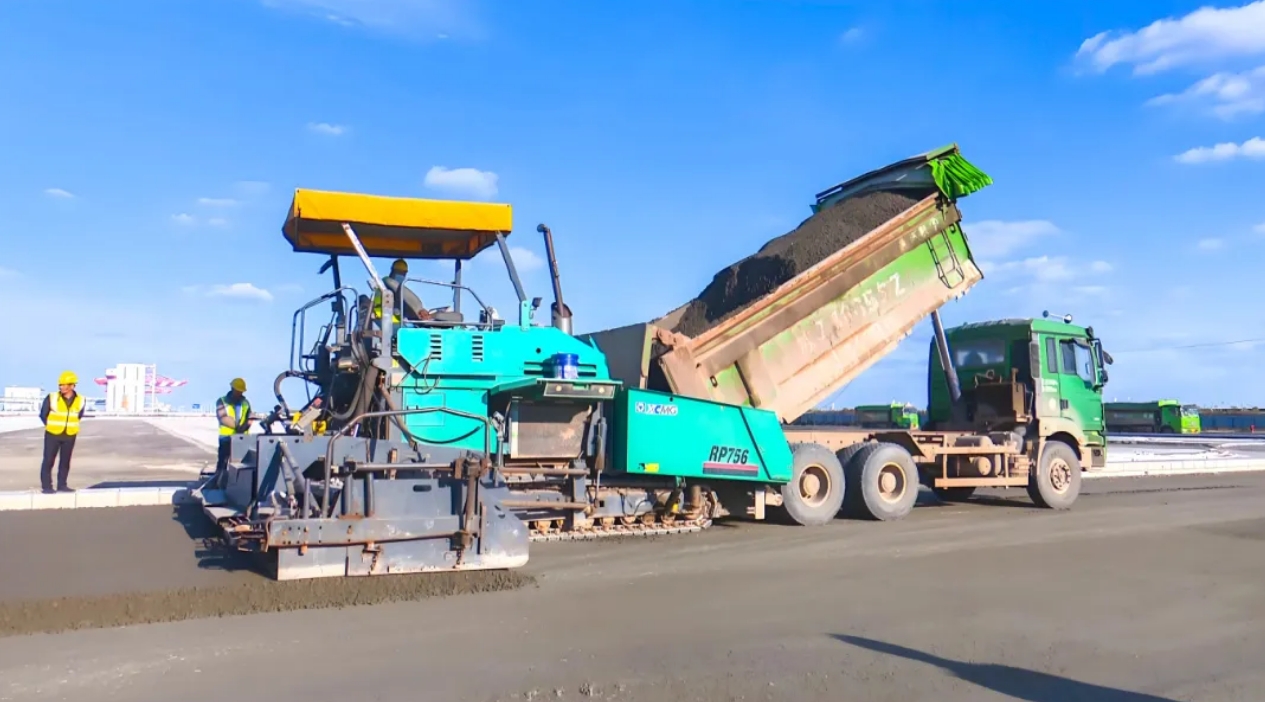 運(yùn)輸車正繁忙地將水泥穩(wěn)定碎石