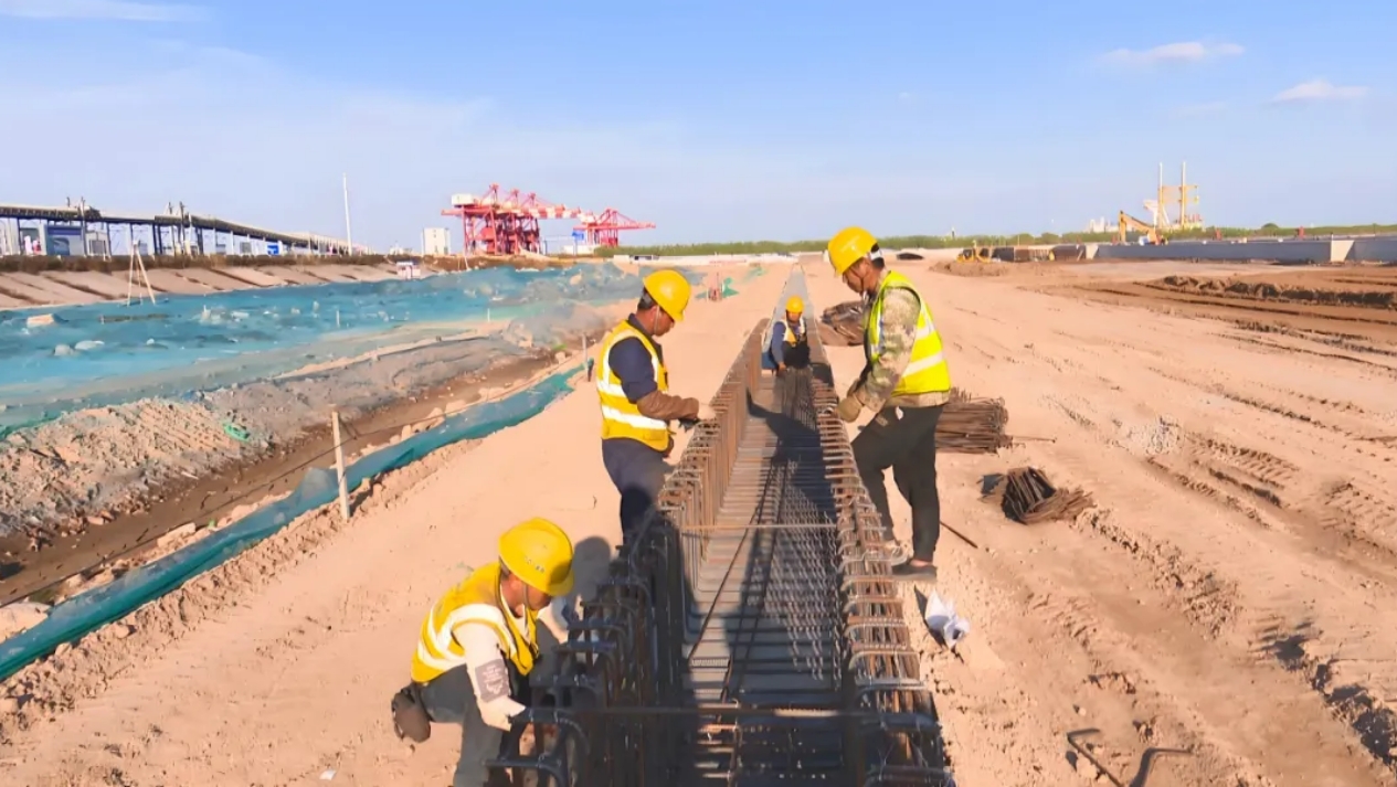 ????濱海港區(qū)主港區(qū)北區(qū)通用碼頭三期工程位于濱海港區(qū)規(guī)劃主港池北側(cè),新建一個(gè)以裝卸散裝為主的公共碼頭,總投資約8億元,共布置10萬噸及通用泊位1個(gè),泊位總長310m,設(shè)計(jì)通過能力為415萬噸/年,可滿足散貨每年270萬噸、件雜貨每年120萬噸的吞吐量要求。項(xiàng)目于2022年12月開工建設(shè),計(jì)劃于今年12月完工。
