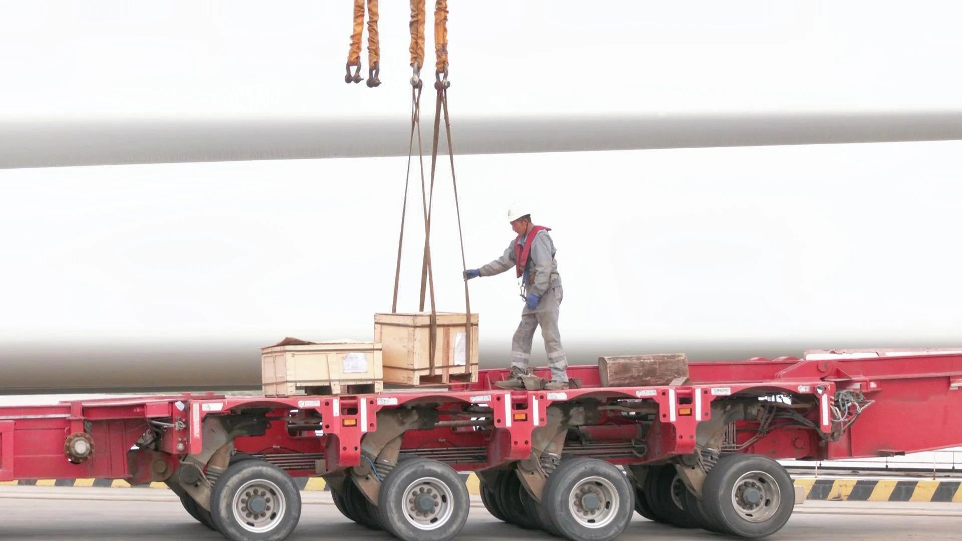 “這批風電葉片發往上海金山,共計36套,單套長度達110米,目前已完成18套的裝載作業,這是第9船次。我們班組正全力協作,力爭在6小時內完成本船次的裝運任務,確保按時離港。”江蘇鹽城港風電裝備進出口港有限公司生產組二班班長祁正磊介紹道。