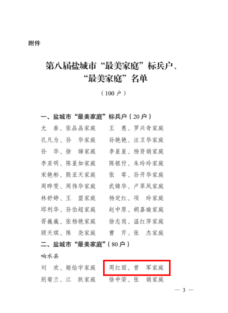 近日,從鹽城市婦女聯合會傳來好消息,在市第八屆鹽城市“最美家庭”評選活動中,鹽城港響水港區曾軍家庭榮獲鹽城市“最美家庭”稱號。